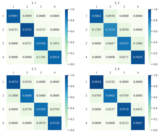 According to the spatial distribution of the traditional Markov transition probability matrix and its transfer (Figure 4), the overall type transfer tendency of urban CEI in the YRB is obvious. Firstly, the probability on the diagonal is far greater than that of the other area in the matrix, and the minimum probability of maintaining the original state is 85.71% throughout the study period, which indicates that the type of urban CEI in the YRB has strong stability on the whole, and the possibility of state transfer is small. Secondly, the stabilities (85.71%, 87.13%) of lower-middle intensity and higher-middle intensity on the diagonal are significantly lower than those of low intensity and high intensity at both ends (94.05%, 91.76%), indicating that there is a higher probability for cities with bipolar-style CEI to maintain their respective CEI types all the time. From the probabilities on both sides of the diagonal, the probability of upward transfer for low-intensity cities is only 5.95%, meaning that the possibility of low-carbon emission cities deteriorating is low. However, the probability of downward transfer for high-intensity cities in the initial year is 8.24%, which indicates that this type of city is in a “path lock” state. In addition, the probability of downward transfer for lower-middle intensity cities (8.57%) is higher than that of upward transfer (5.71%), while the reverse applies to upper-middle cities, indicating that there is a greater probability of upper-middle cities maintaining higher CEI; Thirdly, in the transition probability matrix, the elements with a probability of 0 are far away from both sides of the diagonal, which indicates that the probability of adjacent type transfer of urban CEI in the YRB is small and the possibility of cross-stage transfer is also small.