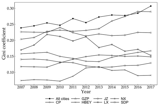 The spatial Markov transition probability matrix reveals the overall spatiotemporal evolution trend in urban CEI in the YRB, and the relevant conclusions indicate that it is of necessity to analyze differences in CEI in YRB urban agglomerations specifically. Therefore, this study further identifies the differences and the changes in different urban agglomerations in the YRB by calculating Dagum’s Gini coefficient.