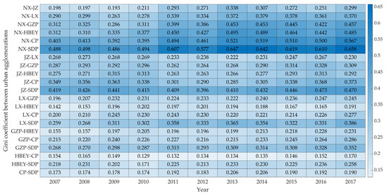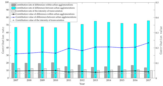 Therefore, GI represents the total contribution of the differences in urban CEI within each urban agglomeration to the overall difference, GB represents the contribution of the net differences between urban agglomerations, GHB represents the contribution of the inter-regional intensity of transvariation between urban agglomerations, and GB + GHB represents the total contribution of the differences between urban agglomerations. If the overall Gini coefficient G is higher, the overall differences in the CEI of urban agglomerations in the YRB will be larger. In addition, the smaller the contribution of the inter-regional intensity of transvariation between urban agglomerations, the smaller the contributions of regional differences caused by sample overlapping.
