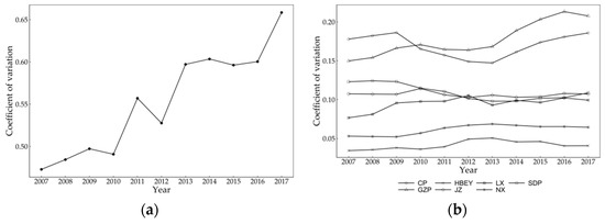 The evolutionary trend of σ convergence of CEI of urban agglomerations in the YRB from 2007 to 2017. (a) All cities. (b) Urban agglomerations.