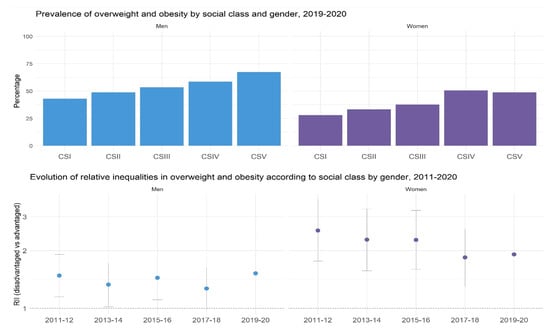 Example of figures included in the Barcelona Social Health Inequalities Surveillance System. CS: social class, where I is the most advantaged, V the least advantaged, RII: Relative index of inequality comparing social classes. The figure includes population ≥ 15 years of age.