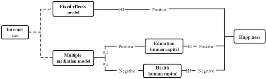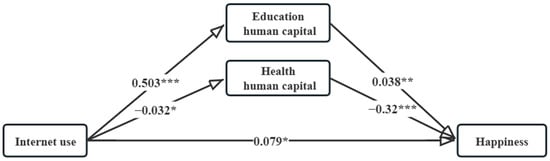 Based on panel data from CFPS and cross-sectional data, this paper analyzes the relationship between Internet use and the happiness of Chinese rural residents by constructing a panel model as well as a mediation model. Additionally, by introducing household education human capital and household health human capital as mediating variables, this paper explores the transmission mechanism of rural residents’ happiness. Multiple mediator analysis is conducted by using Mplus software to understand the relationship between Internet use and happiness. The main conclusions are shown in Figure 2.