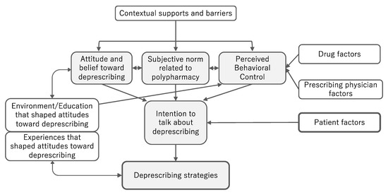 In this study, we conceptualized the metacognitive process of deprescribing and related influencing factors using TPB. Healthcare providers acted on the basis of their attitudes and beliefs on deprescribing, the influence of subjective norms, and perceived behavioral control over deprescribing. These processes are influenced by factors such as drugs, prescribers, patients, deprescribing experience, and environment/education. Furthermore, our results highlight the process of nurturing attitudes, beliefs, and behavioral control over prescribing by reflecting on feedback from personal experience, the environment, and education. These results can serve as a foundation for the development of effective patient-centered deprescribing to improve the quality and safety of care for older adults.