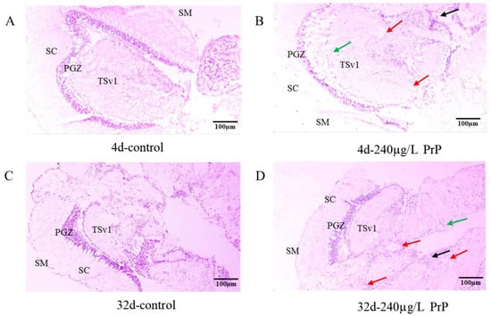 As a pivotal organ responsible for detoxification, metabolism, immunization, and epidemic prevention, chemical-induced hazardous effects usually appear primarily in the liver []. Available literature revealed that PrP is hepatotoxic. PrP induced disruption of energy metabolism and increased synthesis of superoxide anions and apoptosis in the liver cells []. PrP (4.0 mg/L) caused oxidative stress (a decrease in 6d and an increase in 12d of total glutathione) in the liver cells of Nile tilapia (Oreochromis niloticus) []. Hepatic atrophy and cellular degeneration in the brain were found in the 13 dpf-old medaka eleuthero-embryos exposed to 4000 μg/L PrP during embryo development []. In the present work, similar findings were shown in the histological liver structures from PrP groups, which reflected the biochemical changes and failure of cellular protective mechanisms under PrP stress.