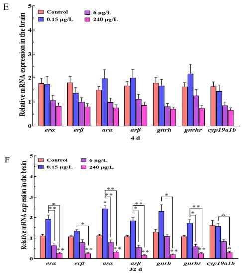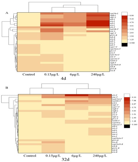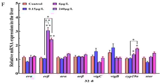 Interestingly, the expression trends of erα, erβ, arα, arβ, vtgB, vtgC, star, and cyp19a in the liver of the 4d-PrP treatments were all up-regulated and higher than that of the 32d-PrP groups (Figure S2). Among these genes, the expressions of erα, erβ, arα, arβ and cyp19a in all the PrP groups at the two time points were significantly different (p < 0.05). In the 6 and 240 μg/L PrP groups, there was a significant difference between the expression of vtgB and vtgC with different exposure durations (4d and 32d) (p < 0.05). Besides, the mRNA level of the star gene in the 0.15 μg/L PrP group varied significantly due to different exposure times (p < 0.05).