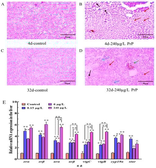 Histological appearance of hepatocytes in the liver of male mosquitofish from the control ((A): 4d and (C): 32d) and PrP-severely affected group (240 μg/L PrP) ((B): 4d and (D): 32d). Bars = 50 μm, n = 20. Black arrows: hepatic sinus dilatation; Red arrows: cytoplasmic vacuolation; Blue arrows: cytolysis; Green arrows: nuclear aggregation. (E,F): transcriptional levels of HPGL axis related genes in the liver of male mosquitofish suffered from 0, 0.15, 6 and 240 μg/L PrP treatment for 4d (E) and 32d (F), respectively. Data were analyzed by t-test and Tukey’s multiple comparisons. Asterisks (*) above the bars indicate statistical significance (* p < 0.05, ** p < 0.01, △ p < 0.08). erα, estrogen receptor alpha; erβ, estrogen receptor beta; arα, androgen receptor alpha; arβ, androgen receptor beta; vtgB, vitellogenin B; vtgC, vitellogenin C; cyp19a, cytochrome P450, family 19, subfamily A; star, steroidogenic acute regulatory protein.