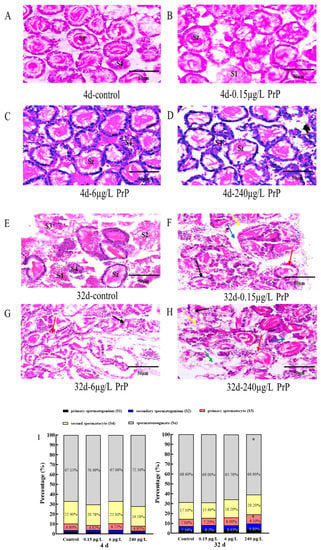 The proportion of germ cells at different developmental stages were analyzed in 100 cells of each fish. The statistical results showed that when exposed to PrP for 4 d and 32 d, there was no significant difference in the proportion of different sperm cells between the control and PrP treatment groups (p > 0.05) (Figure 3I). However, the ratio of mature sperms (Sz) (60.9%) in the 32 d- 240 μg/L PrP group decreased significantly compared to that of 4 d- 240 μg/L PrP group (72.3%), contrarily, the percentage of primary spermatocyte (S3) in the 32 d- 240 μg/L PrP group (9.1%) was higher than that of 4 d (4.92%), which indicated that PrP may induce a delayed spermatogenesis.
