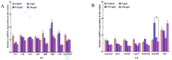 In the testes, the changes of the expression trend were complicated (Figure S3), which indicated that the genes response in the testes were controlled by multiple factors. Statistics analysis showed that some of the tested genes were significantly expressed (p < 0.05) with different exposure times, i.e., hsd20b at 0.15 μg/L PrP group, shh and star at 6 μg/L PrP group, star and hsd17b3 at 240 μg/L PrP group. Among these genes, the star gene in the 32d-PrP treatments were up-regulated and higher than that of the 4d-PrP groups (6 and 240 μg/L PrP).
