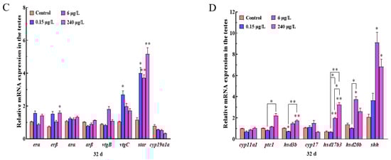 There were no significant changes in 15 endocrine-related genes (erα, erβ, arα, arβ, vtgB, vtgC, star, cyp19ala, cyp11a1, ptc1, hsd3b, cyp17, hsd17b3, hsd20b and shh) in all treatments (0.15, 6 and 240 μg/L) (p > 0.05) after PrP exposure for 4d (Figure 4A,B). In the 32d PrP treated fish, the expressions of vtgC gene in the 0.15 μg/L PrP group, hsd20b gene in the 6 μg/L PrP group, as well as erβ gene in the 240 μg/L PrP group were all stimulated (p < 0.05). The star transcription in all the PrP groups raised sharply (p < 0.05). Increased expressions of hsd17b3 and shh were all observed in the 6 and 240 μg/L PrP groups (p < 0.05). In the condition of hsd3b gene, the gene was down-regulated in the 0.15 μg/L PrP group (p < 0.05) while up-regulated in the 240 μg/L PrP group (p < 0.01) (Figure 4C,D).