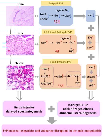 Overview of toxic effects and endocrine disruption in the male mosquitofish suffered from 0, 0.15, 6, 240 μg/L PrP for 4d and 32d. PrP exposure induced morphological injuries in the brain, liver and testes, and caused delayed spermatogenesis. The transcriptional level changes of the genes along the hypothalamus-pituitary-gonadal-liver (HPGL) axis suggested that PrP stimulated abnormal steroidogenesis, estrogenic effects or antiandrogen effects.