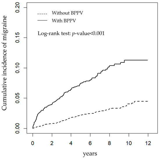 As shown in Figure 1, the BPPV group had a higher cumulative incidence of migraine than the matched control group, with the log-rank test showing the difference (p < 0.001).