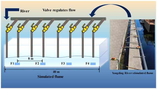 We used a univariate study design, with traffic as the only variable. A 35-day artificial river mesoscale simulation experiment was conducted downstream of a small power station in the Yongding River Diversion Canal in Beijing, China. To study the response of algal communities to three different flow conditions, we built a straight channel with a length of approximately 40 m (made of cement mortar and masonry), a width of 0.6 m, and a depth of 0.5 m (Figure 1). Additionally, we also made thick water pipes with a length of >20 m and an inner diameter of 0.1 m as water delivery containers. The experimental water was taken from under the Yongding River Barrage by eight submersible pumps with a flow regime of 10 m3/h and two sets of 25 m3/h linked to the water delivery container for redistribution, facilitating the control of the total diversion flow. The water was redistributed and tapped on the four channels by the water pipe for use. We also installed a regulating valve at the inlet of each channel to regulate the water level stability and the flow regime step change by modifying the valve opening to have four different flow conditions. Four sets of 7 × 9 cm marble tiles provided by the supplier were placed symmetrically in the middle of the channel section. Before starting the experiment, the channel was run with water for 2 weeks to allow benthic algae to grow, the channel was exposed to sunlight with a wide view, and the channel bottom did not contain any mineral or organic sediments. In May 2022, we measured the lowest velocity of benthic algae growth area at 0.086 m/s, so we chose 0.086 m/s as the basic velocity, and the maximum velocity was five times that of the base velocity. During the experiment, we kept the base velocity unchanged.