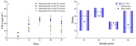 The temporal evolution of Chl-a (μg/cm2) in the four flow sections of the experiment is shown (Figure 2a); the effect of different flow velocities on Chl-a among benthic algae on the seventh day was not significantly different (0.05 < p < 0.7). However, the effect was significant on the 14th day (ANOVA, p < 0.05), the 21st day (ANOVA, p < 0.05), and the 28th day (ANOVA, p < 0.05). At the end of the experiment, the biomass of the F4 section (0.418 m/s) was much lower than that of the F1 (0.086 m/s) and F2 (0.125 m/s) sections. Throughout the study period (Figure 2b), biomass levels were sensitive to water flow velocity. The median and mean values of Chl-a first increased and then decreased. The statistical value of the highest-velocity section (F4) was the lowest. Additionally, the overall benthic algal biomass of F4 was much lower than that of F1 after the river ecosystem reached specific flow values (F3 and F4). This shows that the overall benthic algal biomass is significantly reduced with increased flow.