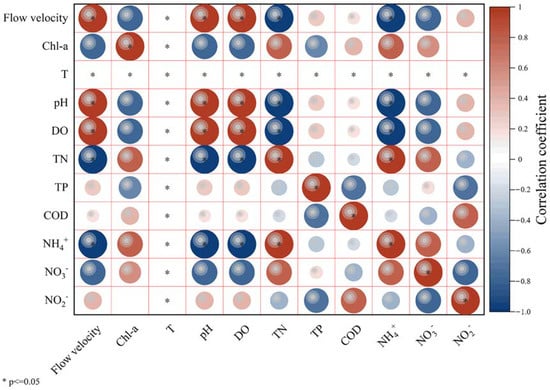 Water temperature, pH, dissolved oxygen (DO mg/L), and other parameters were measured on-site using a calibrated portable multiparameter water quality analyzer (Multi 3630 IDS, WTW, a subsidiary of Xylem Inc., Weilheim, Germany). We took an appropriate number of water samples to the lab to measure total phosphorus (TP mg/L), total nitrogen (TN mg/L), nitrate nitrogen (NO3− mg/L), nitrite nitrogen (NO2− mg/L), and ammonia nitrogen (NH₄+ mg/L) contents, following the standard method recognized by USEPA, using a UV spectrophotometer (DR6000, HACH, Loveland, CO, USA). The flow velocity was monitored on-site using a portable flow velocity meter (LS300-A, Nanjing Xiangruide Electric Technology Co., Ltd., Nanjing, China).