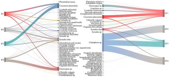 The Sankey diagram (Figure 4) shows more directly the changes in species relationships. The different streamlines indicate obvious differences in the algae canal section. Before and after the experiment, the high-velocity environment promoted an increase in the relative abundance of most benthic algae with strong adhesion, such as Cocconeis placentula; in contrast, the low-velocity environment gathered most planktonic or weakly attached algae (e.g., Gloeocapsa sp.).