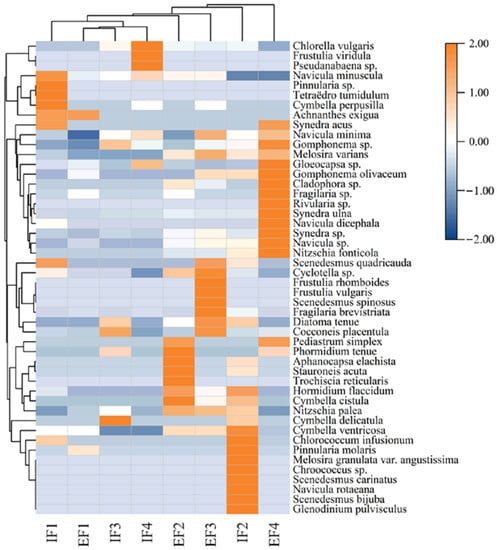 Hierarchical clustering heat map of benthic algae abundance level treated with four flow velocities (Note: IFi represents the sample at the initial stage of the experiment, and EFi represents the sample at the end of the experiment. The higher the relative abundance of the species, the brighter the color).