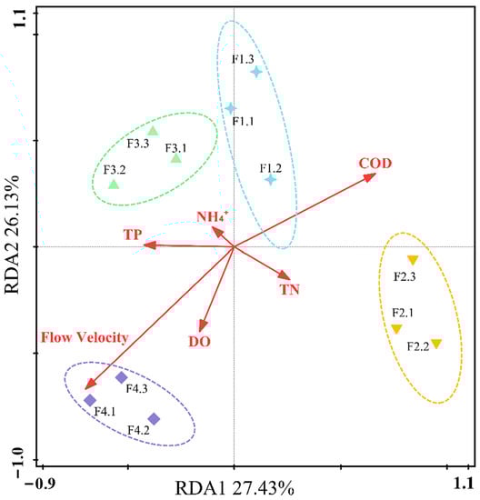 We performed RDA to identify major environmental variables associated with changes in the benthic algal community structure (Figure 6). The first two axes represent 27.43% of RDA1 and 26.13% of RDA2 for benthic algal community structure changes, indicating that selected environmental factors drove differential changes in the benthic algal community structure. Of all the basic indicators studied, flow velocity had the most significant impact on benthic algae and can explain most of its community structure changes. In the RDA score chart, it can be seen that the distribution of the four groups of community sample groups is widely spread, which reflects the great difference between sample communities in each section of the open channel with a velocity gradient. The flow velocity arrow and the origin are the longest, indicating that the correlation between flow velocity and community distribution in species distribution was the largest and negatively correlated, explaining 25.4% of the variance components of the benthic algae community changes (p = 0.01). This further demonstrates that an increased flow velocity reduces the benthic algae levels. In conclusion, flow velocity greatly influences the diversity of the benthic algae community and is the main indicator affecting the change in benthic algae in the channel.
