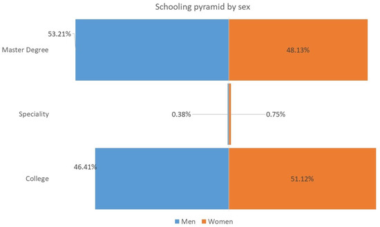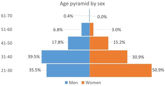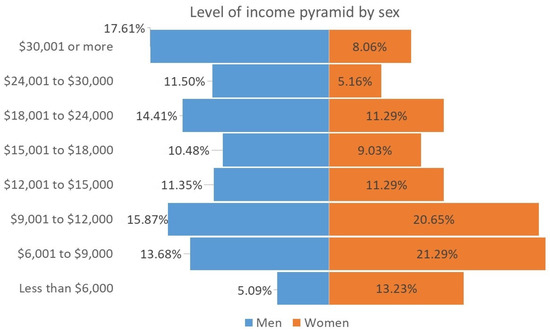 Below are three graphs that represent some variables of interest for the study. Figure 1 describes the age pyramid by sex. It is observed that the base of the pyramid is greater in the case of women. As can be seen, close to 80 of the respondents are under 40 years of age. Figure 2 shows almost half of the sample, for both men and women, are graduates of a bachelor’s degree, while the other half graduated with a master’s degree; the proportion of specialty graduates is less than 1%, both for men and for women (the survey does not collect responses from high school graduates). Figure 3 shows information about the annual income level. It is noted that 13% of the women in the sample belong to the lowest income group (less than $6000 dollars per year), while only 5% of the men report this situation. It can also be seen that 17% of men reach the highest level of income (above $30,000 dollars annually), and only 8% of women have achieved that level of income. This situation can be associated with the fact that a greater number of women surveyed are under 30 years of age and have spent less time in the labor market.