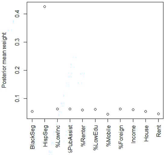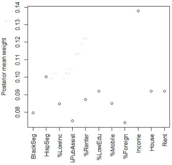 Posterior mean weights for variables in the crude model of neighborhood deprivation index for childhood leukemia. Note: components are Black segregation, Hispanic segregation, ratio of income to poverty <1, percent receiving public assistance income, percent of renters, percent with no high school diploma, percent in a different house than 1 year ago, percent foreign born, per capita income, median house value, and median gross rent.