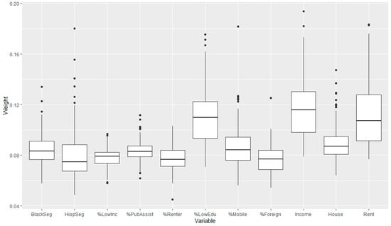 Distributions of neighborhood deprivation index component weights for the crude models for the 100 simulated datasets from the first sampling scheme for participants, where there are some large values above the body for most variables. Note: components are Black segregation, Hispanic segregation, percent of households with ratio of income to poverty <1 (below the poverty threshold), percent receiving public assistance income, percent of renters, percent with no high school diploma, percent in a different house than 1 year ago, percent foreign born, per capita income, median house value, and median gross rent.