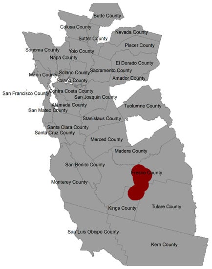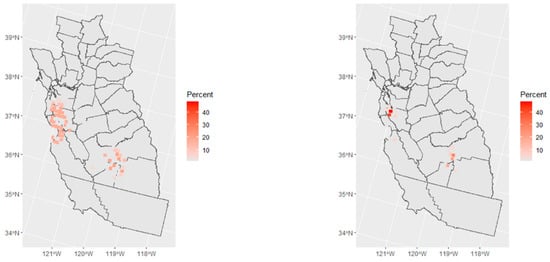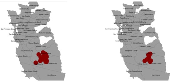 The two methods for cluster detection without covariates found a similar area as the model in Equation (4) for the observed data, albeit slightly larger and including Tulare County illustrated in red (Figure 6). However, the simulation study bias analysis results (Table 3) provided reduced evidence for the existence of the observed cluster when adding participants to achieve the full participation of eligible cases and controls. When using the local spatial scan statistic, a cluster was identified in 37 and 30 of the 100 datasets using the first and second weighting schemes for control participants, but only 20 and 12 of the 100 datasets produced a cluster that overlapped with the observed cluster from the same method. When using the BYM model, a spatial cluster was identified more frequently in 55 and 41 of the datasets using the first and second selection approach, but only 23 and 12 of the datasets had a cluster overlapping the observed one. As expected, both detection methods were less likely to find the observed cluster if controls had a higher probability of selection in lower SES areas. However, even in this participant selection approach the observed cluster was detected in 12 of the 100 datasets after overcoming selection bias, meaning that selection bias did not completely explain the observed spatial cluster. The maps of the number of times areas were detected as significantly elevated risk over the 100 datasets from the first scheme show two areas (Figure 7). One is the observed cluster area in Fresno and Kings Counties as well as Tulare County, depending on the method, and the other area is the south of San Francisco and overlapping with a spatial–temporal cluster that was previously detected in a California statewide analysis of childhood cancers including leukemia [].