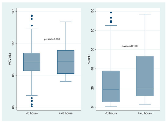 Only 399 individuals had a full record of the time from venesection to FBC analysis. The time a specimen was received at the laboratory was used as a proxy for the time to analysis, as reports did not specify analysis times. With a median of 2.6 h (IQR = 2.2 h), all FBC analyses were undertaken within 24 h. Figure 2 shows no statistically significant difference in the median MCV in those analysed <8 h and ≥8 h (p = 0.766) and in the median %HPO for those analysed <6 h and ≥6 h (p = 0.176).