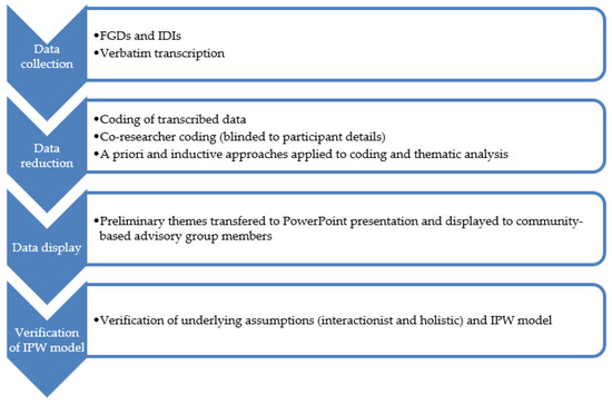 The research team adopted the steps illustrated by Roberts and colleagues [48]: (a) initial code sources developed through a literature review identifying a theoretical framework; (b) initial code development by application of raw qualitative data through a priori coding and IPA coding, code testing by co-author (TF), who was blinded to participant identity, and achieving code/theme saturation; (c) codebook development involving labelling the codes and grouping codes to recurring themes and domains; (d) codebook application with review by community-based advisory group members to confirm coding categories; and (e) conceptualisation of the phenomena using the theoretical framework and assumptions outlined earlier to develop a model of IPW.
