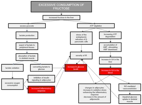 Fructose is converted to glucose when its consumption is moderate. At the same time, high fructose consumption leads to excessive GLUT 5 induction, increasing the concentration of fructose in the cytosol of the intestinal epithelial cells []. In addition, ATP depletion occurs during fructose metabolism, which leads to inflammation and oxidative stress. It causes disruption of the functioning of some tissues and organs and the excessive production of pro-inflammatory cytokines []. In addition, UA is produced during ATP depletion, which increases intestinal permeability and exacerbates lipogenic processes in the liver []. The body’s reactions to excessive fructose consumption are presented in Figure 2.