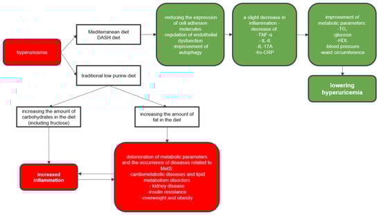 Consequences of improper dietary interventions in patients with hyperuricemia and MetS-related diseases. Following a low-purine diet leads to supplementation of calories with carbohydrates and fats, which may exacerbate MetS-related conditions. The use of an otherwise balanced diet (Mediterranean, DASH) may alleviate the symptoms of MetS and reduce hyperuricemia. Abbreviations: TG—triglycerides; HDL—high density lipoprotein; MetS—metabolic syndrome; TNF-α—tumor necrosis factor α; IL-6—interleukin 6; IL-17A—interleukin 17A; hs-CRP—high sensitivity C-reactive protein; DASH—Dietary Approaches to Stop Hypertension diet.
