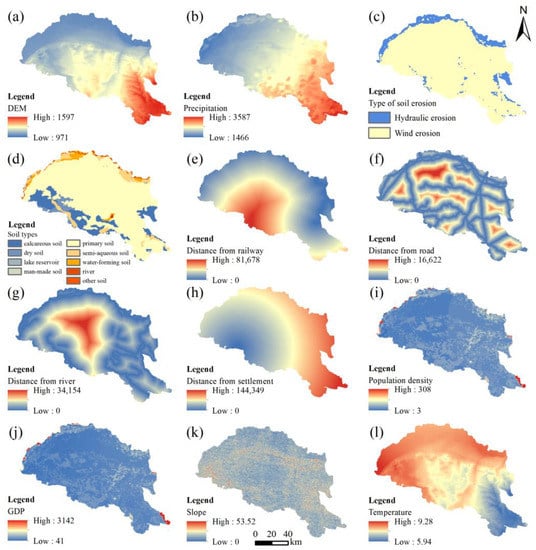 Land-use driving factors. (a) DEM. (b) Precipitation. (c) Type of soil erosion. (d) Soil types. (e) Distance from railway. (f) Distance from road. (g) Distance from river. (h) Distance from settlement. (i) Population density. (j) GDP. (k) Slope. (l) Temperature.