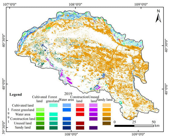 The data sources were based on land-use data of 30 m resolution from 1991, 2000, 2010, and 2019 in Hangjin Banner from the Geospatial Data Cloud (https://www.gscloud.cn/; accessed on 11 October 2020) []. Where the original projection coordinate system in 1991 was WGS_1984_UTM_Zone_48N, we changed it to the same projection coordinate system as for 2000, 2010, and 2019; therefore, this was an area error in the projection transformation (<1 km2). According to the classification standard of the Land-Use Status Classification (GB/T210102017), we classified land-use types into cultivated land, forest grassland, water area, construction land, unused land, and sandy land. After radiometric calibration and atmospheric correction pre-processing, image information was extracted from the study area using supervised classification.