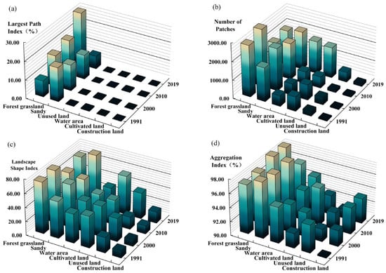 Changes in the landscape indexes at the class scale along the Yellow River section of the Hobq Desert from 1991 to 2019. (a) Largest Path Index. (b) Number of patches. (c) Landscape Shape Index. (d) Aggregation Index.