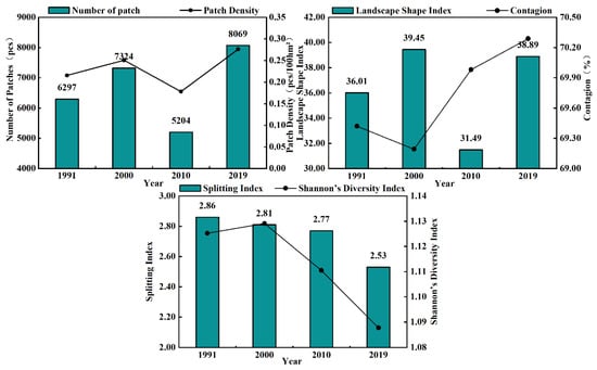 Landscape pattern refers to the spatial design made by a series of landscape elements of diverse sizes and shapes arranged in different ways in the space, including the number, type, and spatial distribution and configuration of landscape components, which have an important influence on the function of regional ecosystems []. Considering the different ecological significance of landscape indicators and the large correlation between certain indicators, we selected the patch density (PD), number of patches (NP), landscape shape index (LSI), largest patch index (LPI), splitting index (SPLIT), Shannon’s diversity index (SHDI), aggregation index (AI), and contagion index (CONTAG) to monitor landscape pattern information, which was calculated using fragstats 4.2. The expressions and ecological meaning are shown in Table 1.
