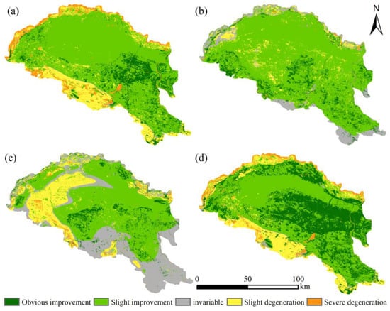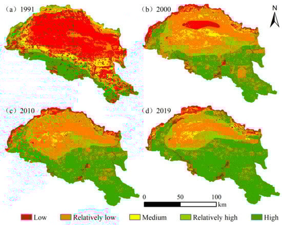 Spatial variation in habitat quality. (a) 1991–2000. (b) 2000–2010. (c) 2010–2019. (d) 1991–2019.