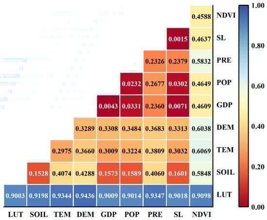 According to the accuracy and realism of the PLUS model, we selected 12 drivers affecting land-use change from natural, socio-economic, and accessibility aspects to carry out land-use prediction research. DEM data were derived from the Geospatial Data Cloud, and slope was calculated using ArcGIS10.8’s slope module. Meteorological data (annual average temperature and annual precipitation) were taken from the National Meteorological Science Data Center (http://www.geodata.cn/; accessed on 30 October 2022) []. Soil type and erosion, water system distribution, and socio-economic data (GDP and population density) were taken from the Data Center for Resource and Environmental Sciences, Chinese Academy of Sciences (https://www.resdc.cn; accessed on 30 October 2022) []. The distribution of current roads, highways, railroads, and settlements was derived from the Global Geographic Information Resources Directory Service (https://www.webmap.cn/; accessed on 28 October 2022) [], and the accessibility factor was calculated using Euclidean distance tools of ArcGIS 10.8. All data were transferred to 30 × 30 m raster files with the same rows and columns according to PLUS model input data requirements.