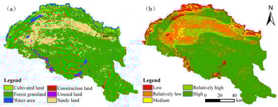 Spatial projections of land use and habitat quality along the Yellow River section of the Hobq Desert in 2030. (a) Land-use distribution. (b) Habitat quality.
