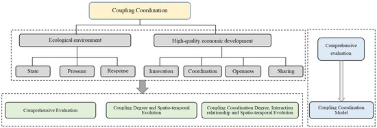 According to existing literature, the academic research on EE and HQED still has the following deficiencies: first, rich research results have been achieved on HQED, but the comprehensive evaluation and evaluation index system of EE and HQED are still insufficient. Second, there is only a small amount of literature on the coupling and coordination of EE and HQED. EE is the primary bottleneck constraining economic development [21] and is also the key factor for promoting HQED [22]. Therefore, the necessity of coupling and coordinated development of the two should be studied and discussed holistically in order to foster sustainable development of the regional economy. Specifically, in order to make up for the lack of existing research, this paper tries to solve the following three problems: (1) How to build an evaluation index system of EE and HQED and evaluate the comprehensive development level. (2) Determining whether there is a coupling coordination relationship between EE and HQED. (3) Identifying what kind of coupling and coordination relationship types and space–time characteristics exist in the sample space.