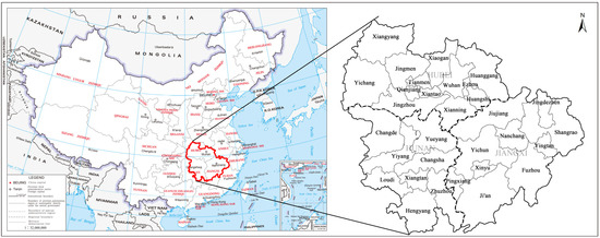 The urban agglomeration in the middle reaches of the Yangtze River is located in central China. It covers 31 cities and an area of 326,100 square kilometers spanning the Hubei, Hunan and Jiangxi provinces, and is the largest urban agglomeration in China (Figure 2) [23]. According to the China Statistical Yearbook, in 2020, the permanent population within the urban agglomeration in the middle reaches of the Yangtze River will account for about 9.4% of the country, and the GDP will account for about 9.3% of the country. The urban agglomeration in the middle reaches of the Yangtze River has unique geographical conditions. It faces the river and the sea and connects the east and the west, as well as the north and the south. It has a vast economic hinterland. It is in an important strategic position in China’s construction of a pattern of major domestic circulation and dual domestic and international circulation [24]. Figure 2 is from the Ministry of Natural Resources of China, drawing review No. GS (2019) 1679.