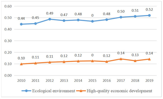 With the excessive consumption of resources and the continuous pollution of the environment, the contradiction between global economic development and the ecological environment is intensifying [1]. Ecological environment (EE) protection and high-quality economic development (HQED) are important conditions for achieving regional sustainable development. China’s economy is facing the urgent need for high-quality development. From the perspective of per capita GDP, China’s per capita GDP will reach USD 10,500 in 2020, still lower than the USD 10,926 global per capita GDP. China is still a big developing country, and its economy is at a stage of high-speed growth toward high-quality development. China’s 14th Five-Year Plan emphasizes “promoting high-quality development”. Since it was published, HQED has become China’s long-term strategic goal [2].