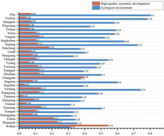 (2) By calculating the average value of the EE index and HQED index of 31 cities from 2010 to 2019, and from the average value of the EE and HQED composite index of each city(see Figure 4), it was found that the EE index and HQED index of each city were significantly different. Of the 31 cities, only Wuhan and Changsha had a higher HQED index than EE index; of the two, Wuhan’s HQED index (0.54) was significantly higher than the EE index (0.31) while Changsha’s HQED index (0.39) was basically the same as the EE index (0.37). The EE and HQED of Ezhou and Huangshi were not much different. The HQED index of the other 27 cities was significantly lower than the EE index, especially for Ji’an, whose EE index was as high as 0.80, while the HQED index was only 0.07. The Fuzhou EE index was 0.78, significantly higher than its HQED index (0.04). For a long time, the emissions of pollutants from the economic development of cities have had adverse effects on EE, especially in heavy industrial cities such as Wuhan, where the development of industry has incurred serious environmental pollution problems [48]. In Ji’an, Fuzhou, Shangrao and other cities, the HQED index is at a low level among the 31 cities, and the EE index is at a high level. This phenomenon reflects that under a relatively low level of economic development, human damage to EE is relatively small [49].