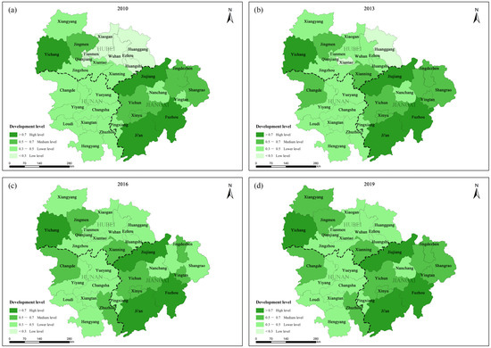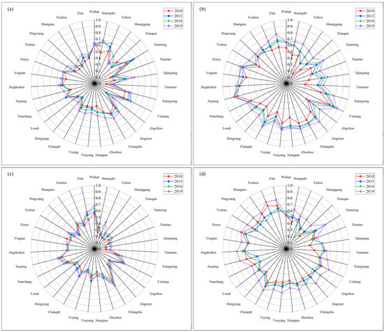 Regarding the spatial distribution of the HQED level, the following order was observed: Hunan > Hubei > Jiangxi. The HQED level was classified into high level (>0.3), medium level (0.1–0.3), low level (0.05–0.1) and very low level (<0.05), and the HQED indexes of 2010, 2013, 2016 and 2019 were determined to draw the comprehensive level space–time change map (Figure 6). In general, Wuhan and Changsha were always at a high level. The number of medium-sized cities has been increasing, from six cities in 2010 (Huangshi, Xiaogan, Ezhou, Nanchang, Xianning, Zhuzhou) to fifteen cities in 2019 (Xianning removed, Yichang, Qianjiang, Jiujiang, Xiangyang, Yueyang, Jingdezhen, Changde, Jingmen, Hengyang, Xinyu added). Low-level cities have been decreasing, from 10 in 2010 to only two in 2019 (Huanggang and Tianmen). Huanggang belongs to the Dabie Mountains, with a weak economic foundation and a relatively good agricultural foundation. Tianmen is located in the Hanjiang Plain, with rich fishery and agricultural resources, and relatively weak secondary and tertiary industries. Therefore, the HQED level of the two places was lowered. Wuhan and Changsha are the provincial capitals of Hubei and Hunan, and they are also the core cities that drive the development of the urban agglomeration in the middle reaches of the Yangtze River. Relying on the original industrial base and convenient transportation location, they have been at the forefront of the economic development of the urban agglomeration in the middle reaches of the Yangtze River [51,52]. In recent years, the two cities have continuously strengthened industrial resources and technological innovation. For example, relying on the original automobile industry, Wuhan has focused on building new energy vehicles, cooperating with Changsha and Zhuzhou to promote the transformation of electric vehicles, and driving the Nanchang metropolitan area to develop new energy vehicles to maintain the advantages of special vehicles. At the same time, it has helped Yichun, Changde, Hengyang, Jiujiang, Jingzhou and other cities to build auto parts bases, promoted industrial cooperation within the urban agglomeration in the middle reaches of the Yangtze River, and optimized the regional layout of the industrial chain [53].