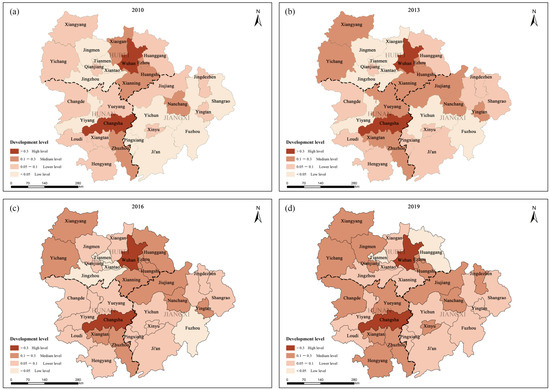 The space–time changes of the comprehensive evaluation level of HQED from: (a) 2010; (b) 2013; (c) 2016; (d) 2019.