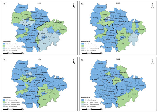 From the perspective of spatial distribution, the overall coupling level of EE and HQED in the urban agglomeration in the middle reaches of the Yangtze River has been continuously improved, with Hunan > Hubei > Jiangxi. In order to more accurately reflect the spatiotemporal changes in CD of the 31 cities in the urban agglomeration in the middle reaches of the Yangtze River, the CDs of 2010, 2013, 2016 and 2019 were determined for mapping (Figure 7). It can be clearly seen that Wuhan, Changsha and Nanchang, the central cities of the urban agglomeration in the middle reaches of the Yangtze River, were always in the advanced coupling stage. The running-in coupling was reduced and upgraded to advanced coupling for cities such as Yichang, Jingmen, Yiyang, Jiujiang, Shangrao, Jingzhou and Pingxiang. Antagonistic coupling decreased from four in 2010 to zero in 2019. In general, with the economic development and the deepening of the integration of the urban agglomeration in the middle reaches of the Yangtze River, the CD of EE and HQED also increased. In particular, Wuhan, Changsha and Nanchang, as the provincial capital cities, have always been in the advanced coupling stage due to their high level of economic development, relatively complete ecological protection measures, and the coupling relationship between EE and economic development that is mutually promoting, interdependent and closely coordinated.
