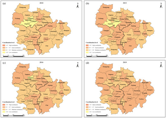 Spatial distribution of coupling level of 31 cities in: (a) 2010; (b) 2013; (c) 2016; (d) 2019.