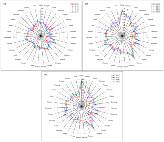The coupling coordination relationship between HQED and the three subsystems of EE is shown in Figure 10. From the overall level of CCD, the CCD of the HQED and three subsystems show pressure subsystem > response subsystem > state subsystem (1). From the perspective of coordination with the pressure subsystem, the EE and the CCD of the response subsystem in Wuhan (0.994), Changsha (0.906), Ezhou (0.789), Nanchang (0.748) and Huangshi (0.731) were at a high-quality coordination in 2019. Huanggang (0.485) and Tianmen (0.411) were at a moderate level of coordination. The remaining 24 cities were at a good level of coordination. (2) According to the coordination relationship with the response subsystem, Wuhan (0.978), Changsha (0.901), Ezhou (0.780), Nanchang (0.732) and Huangshi (0.726) were at a high-quality coordination. Xiantao (0.467), Huanggang (0.454) and Tianmen (0.395) were at a moderate level of coordination. The remaining 23 cities were at a good level of coordination. (3) From the coordination relationship with the state subsystem, there were only two coordination levels: moderate coordination (18 cities) and good coordination (13 cities). It can be seen from the indicator system that the EE status subsystem was relatively stable but also vulnerable to damage. As shown in Figure 10a, the CCD of EE and status subsystems of cities in the middle reaches of the Yangtze River urban agglomeration were relatively stable and the gap was relatively small, indicating that the impact on EE status was relatively small in the development of the middle reaches of the Yangtze River urban agglomeration. At the same time, the CCD of the state subsystem and HQED was also relatively low. The relationship between the pressure subsystem and the response subsystem and the level of economic development is relatively close. It can be clearly seen from the radar chart that the higher the HQED level of cities such as Wuhan and Changsha, the higher the CCD of their HQED and the pressure subsystem and response subsystem.