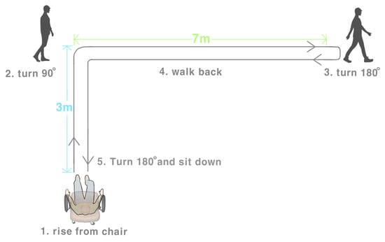 The L Test of Functional Mobility (the L Test) [] was developed on the basis of the TUG Test. The L Test is named for the fact that the walking path in the test is L-shaped []. The L Test incorporates the transfer skill sets used in the TUG Test, as these aid the analysis of patients’ walking abilities and includes a turning motion task that requires patients to turn and walk along a hallway. The L Test incorporates two transfers and four turns, at least one of which must be towards the opposite side. The single condition L Test (stand up from the chair, walk 3 m forward, turn 90 degrees, walk 7 m forward, turn 180 degrees, then walk back along the L-shaped path and sit down on the chair) showed excellent inter-rater reliability and intra-rater reliability (intra-class correlation coefficient (ICC) = 0.990) and significantly correlated with the completion time of the L Test and those of the TUG Test (r = 0.89; p < 0.001) and 10 m walk test (r = 0.88; p < 0.001) in people with chronic stroke [].