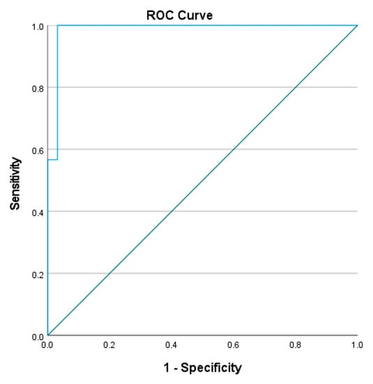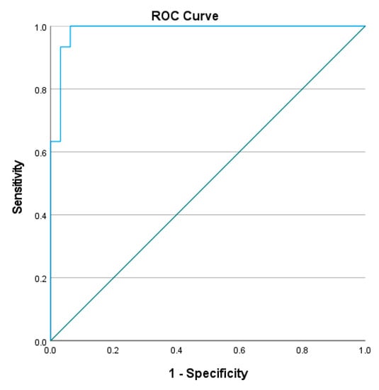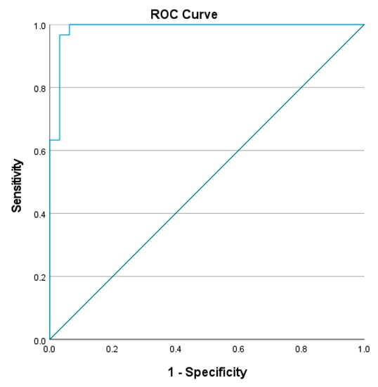 ROC curve of the L Test completion times involving turning towards the paretic side for the 90° and then turning towards the paretic side for the 180° (AUC = 98.6%, sensitivity = 100%, specificity = 90.6%, p < 0.001).