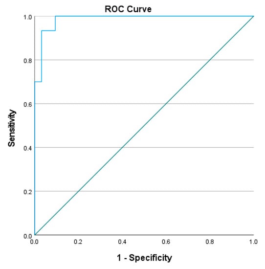 ROC curve of the L Test completion times involving turning towards the non-paretic side for the 90° and then turning towards the paretic side for the 180° (AUC = 98.7%, sensitivity = 96.7%, specificity = 96.9%, p < 0.001).