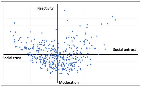 Reactivity (+). Answers adopting the extreme choices on the Likert scale (“Strongly agree” or “strongly disagree”) are aggregated, reflecting a reactive attitude towards experience. In this case, the sense of individual agency (“My life is determined by my actions”) and the feeling of living in a very strong critical scenario where you cannot rely on other people seems to be interpreted in a self-referential way. In other words, the respect for the rules can be subordinated to the interests of ones’ own group of belonging (“sometimes you need to break the rules to help loved ones”) and a day-by-day attitude toward experience (“Nowadays people are forced to live day by day”).