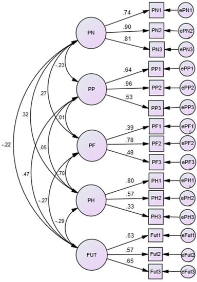 The reliabilities (by Cronbach’s Alpha) were as follows: α = 0.749 (PP); α = 0.856 (PN); α = 0.522 (PF); α = 0.633 (PH) and α = 0.643 (F). For low Cronbach’s Alpha, as in the current analysis for PF and PH, several authors [,] argue that a smaller Cronbach’s Alpha value is acceptable in the case of short versions when the number of items is quite small.